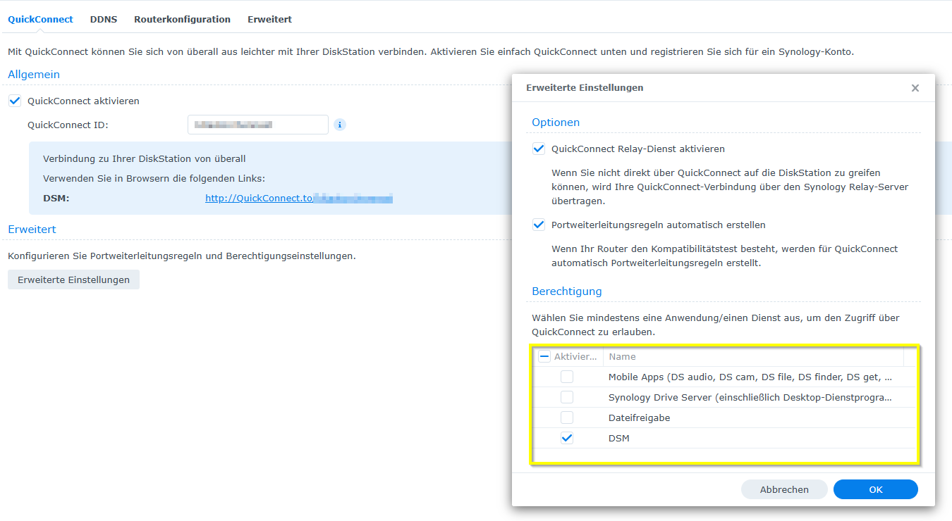 - Überprüfe deine gesamte QuickConnect-Einstellung. Vielleicht gibt es noch andere Dienste, die du nicht unbedingt brauchst und die du deaktivieren kannst.