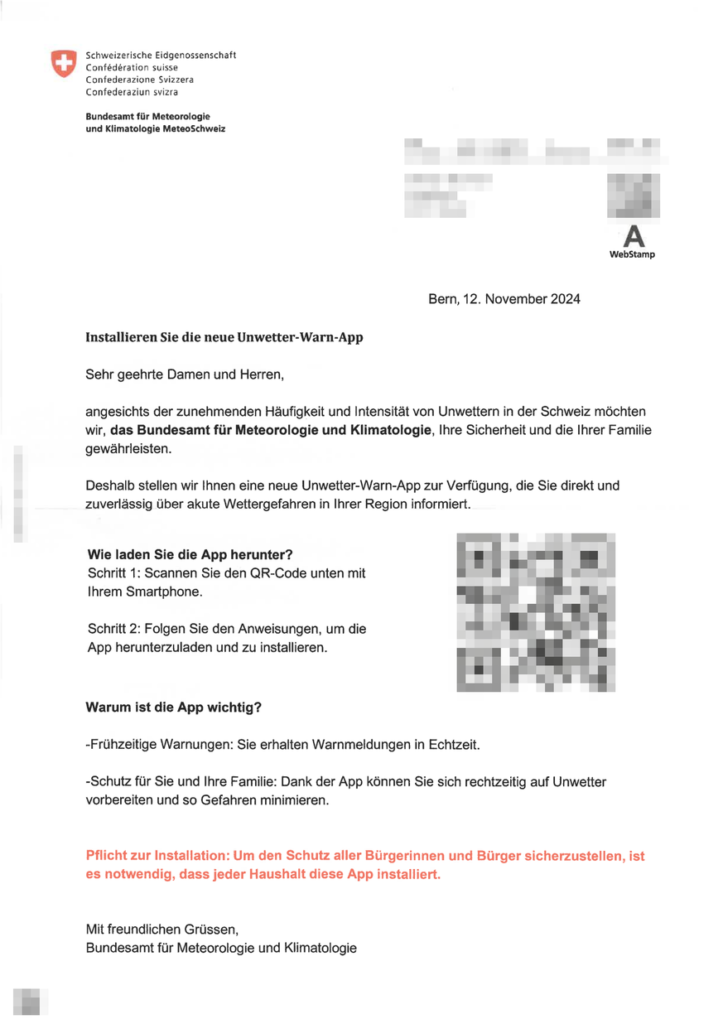 Die Gauner haben sich sehr Mühe gegeben bei der Gestaltung des Briefes. Er gaukelt dir vor, du sollst «angesichts der zunehmenden Häufigkeit und Intensität von Unwettern» die neue Warn-App (Alertswiss) des Bundes installieren. Diese kannst du bequem via QR-Code im Brief herunterladen.