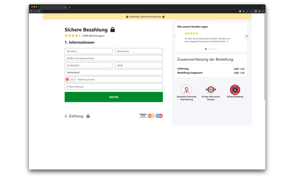 Die Betrüger wollen, dass du auf einen Link klickst und ihnen deine persönlichen Daten gibst. Danach sollen sie angeblich eine kleine Gebühr (CHF 1.95) für den Versand haben. Aber am Ende stellt sich heraus das die Betrüger einen weit aus höheren Betrag abgebucht wurde!
