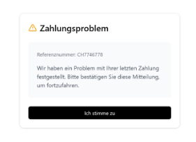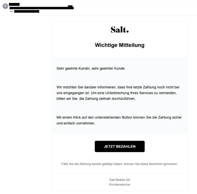Die Gauner versenden E-Mails, in denen behauptet wird, dass ihr eine ausstehende Zahlung bei Salt habt. In der E-Mail wird mit der Drohung einer möglichen Unterbrechung der Salt Dienste Druck gemacht. Um die angebliche Zahlung zu begleichen, werdet ihr aufgefordert, auf einen Link in der E-Mail zu klicken.