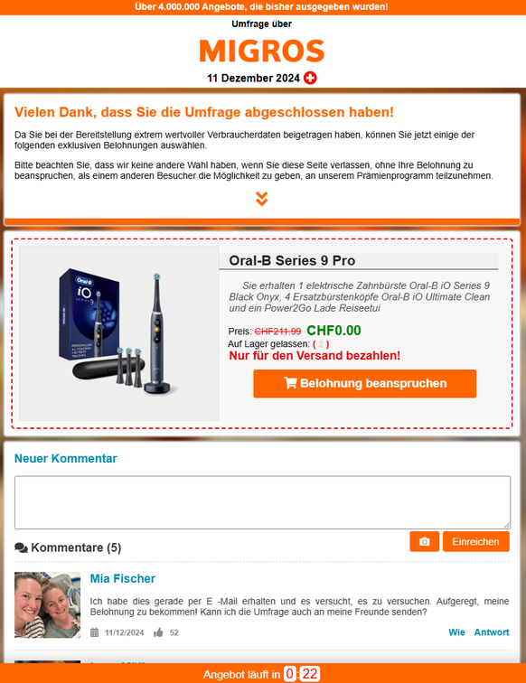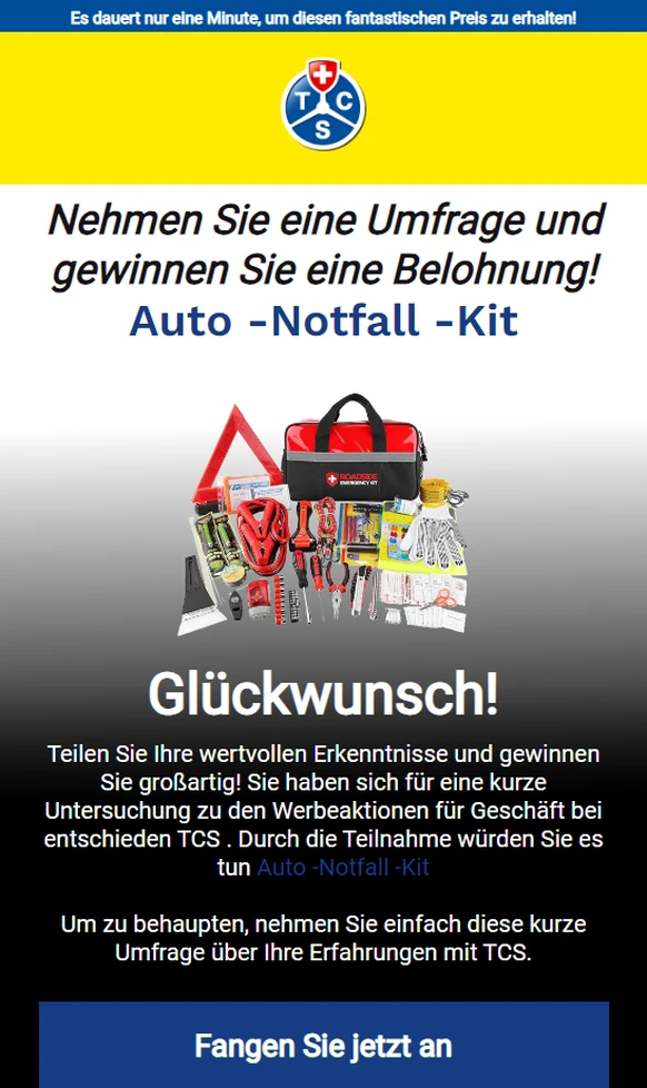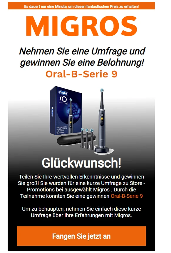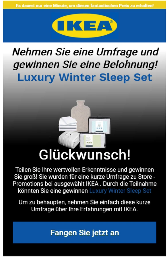 Vorsicht vor gefälschten Umfragen! Gauner imitieren bekannte Unternehmen wie Migros und Ikea, um an deine persönlichen Daten zu gelangen. Sie locken mit attraktiven Preisen wie einer elektrischen Zahnbürste oder einem Notfall-Kit wenn du an dieser Umfrage teilnimmst. Klickst du auf den Link in der E-Mail, landest du auf einer gefälschten Webseite, die täuschend echt aussieht. Zum Schluss sollst du dann „nur“ die Versandkosten übernehmen. Nach Eingabe deiner Kreditkartendaten werden jedoch hohe Beträge von deinem Konto abgebucht.