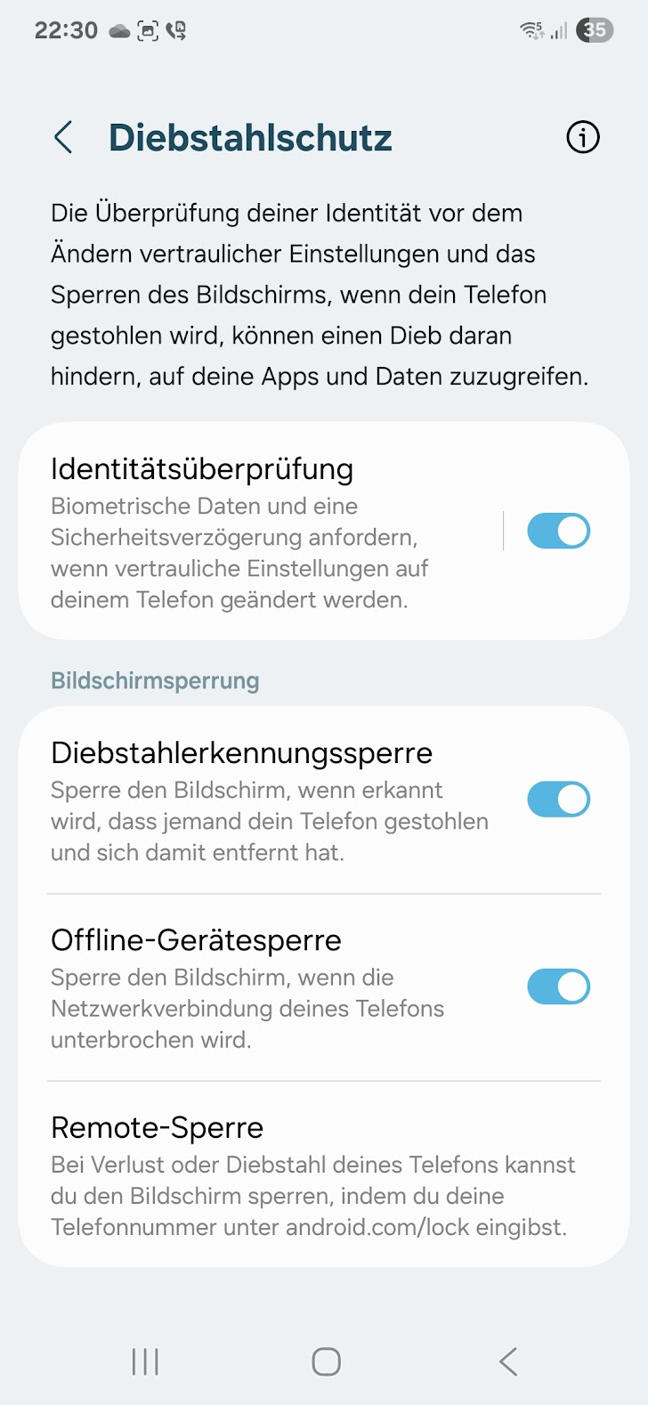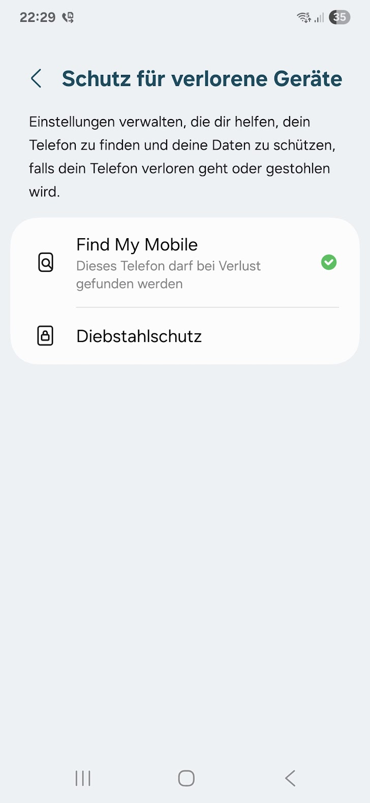 Öffne die Einstellungen und geht zu Sicherheit & Datenschutz > Schutz für verlorene Geräte > Diebstahlschutz > Schutz für verlorene Geräte > Diebstahlschutz. Dort können Sie die gewünschten Sicherheitsfunktionen aktivieren.